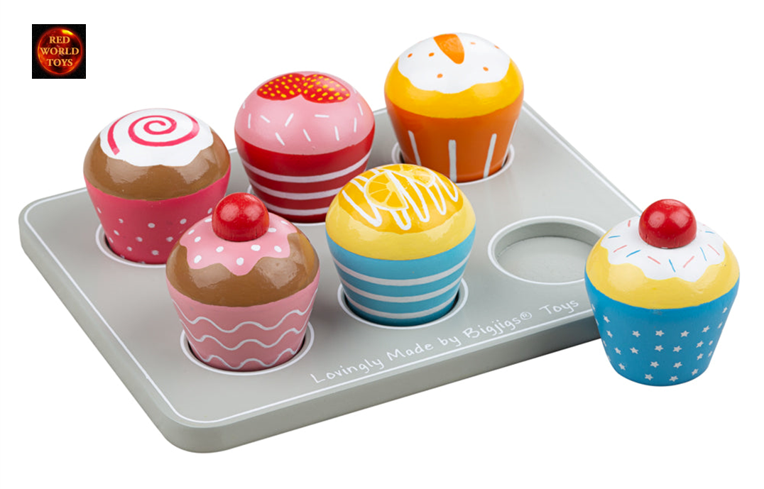 Wooden Play Food Muffin Tray with 6 Cup Cakes